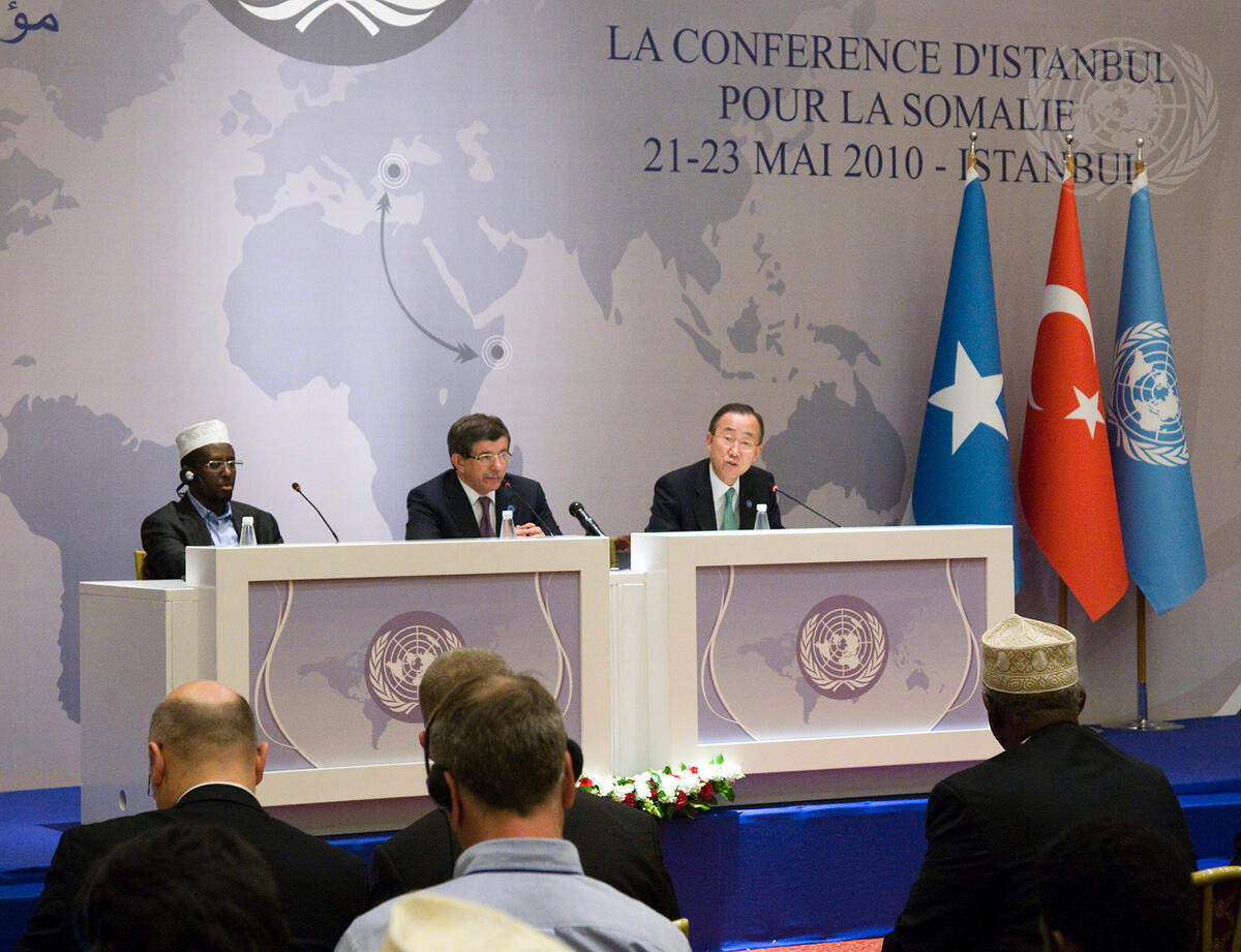Secretary-General Ban Ki-moon (right) addresses a joint press conference with Somali President Sheikh Sharif Sheikh Ahmed (left) and Turkish Foreign Minister Ahmet Davutoglu after closing the UN Istanbul Conference on Somalia, in Istanbul, Turkey.