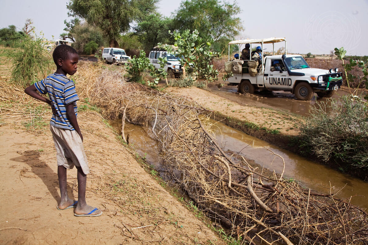 Sudanese boy watches as officers of the African Union-United Nations Hybrid Operation in Darfur (UNAMID) participate in a road trip exercise, dubbed ""Haboob Chase"", that will take them across North and West Darfur. They are pictured in the vicinity of the North Darfur towns of Saraf Omra and Kabkabiya.
