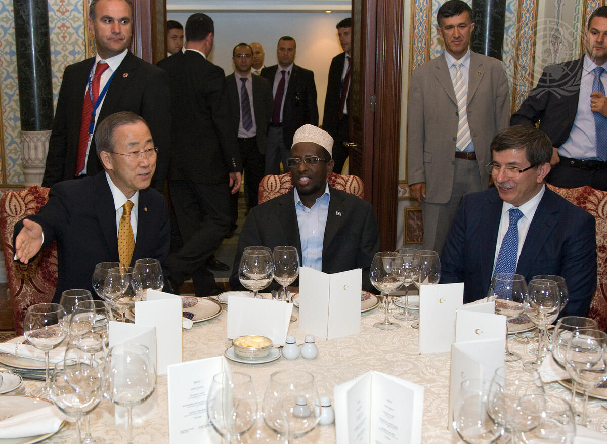 Secretary-General Ban Ki-moon (left) attends a dinner with Somali President Sheikh Sharif Sheikh Ahmed (centre) and Turkish Foreign Minister Ahmet Davutoglu, in Istanbul, Turkey, on the eve of the UN Istanbul Conference on Somalia.