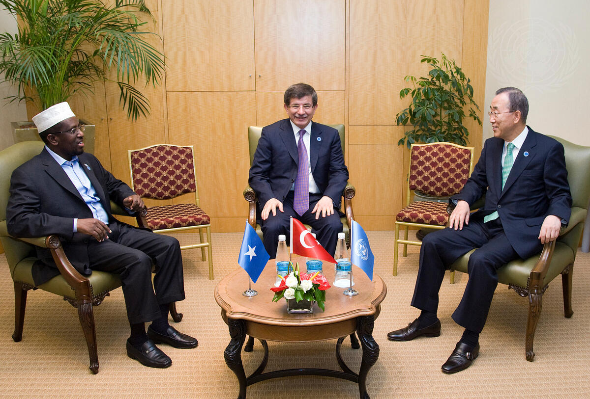 Secretary-General Ban Ki-moon (right) meets with Sheikh Sharif Sheikh Ahmed (left), President of the Somali Republic, and Ahmet Davutoglu, Minister for Foreign Affairs of Turkey, on the morning of the UN Istanbul Conference on Somalia, in Istanbul, Turkey.