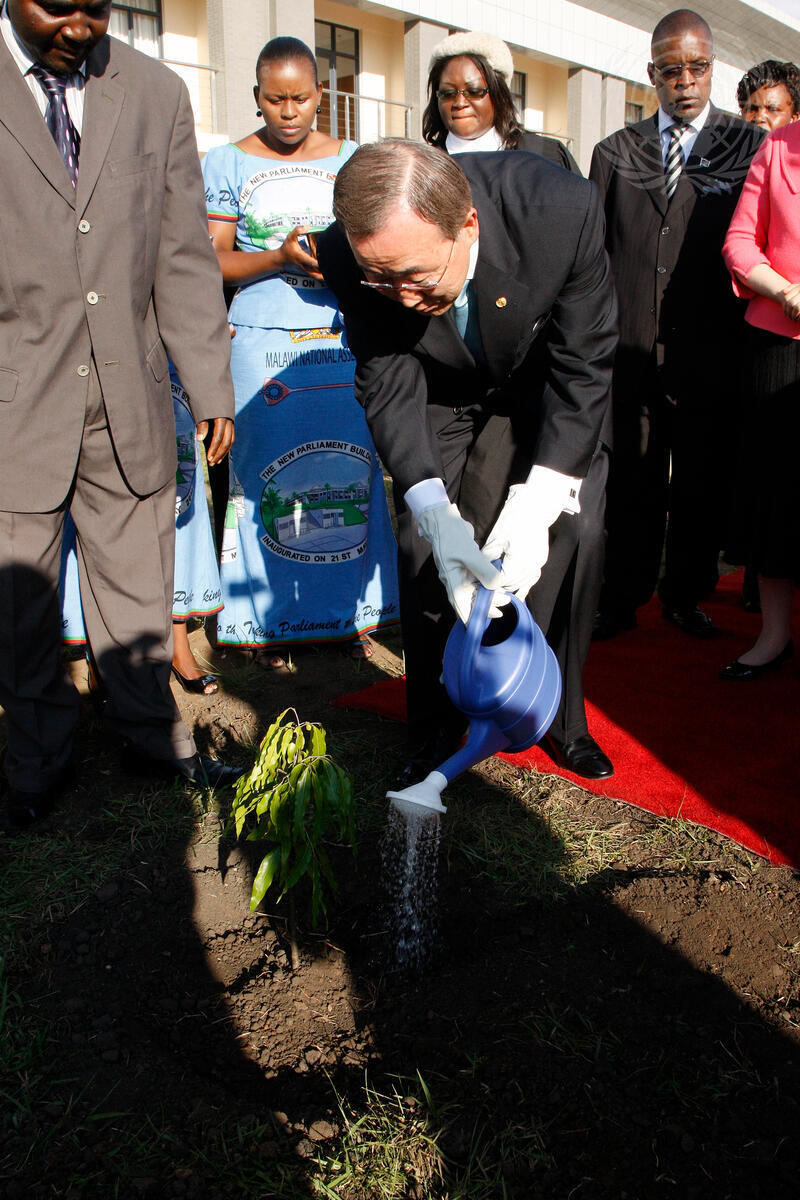 Secretary-General Ban Ki-moon (right) helps plant a sapling in Lilongwe, Malawi, to inaugurate the country's new parliament building.