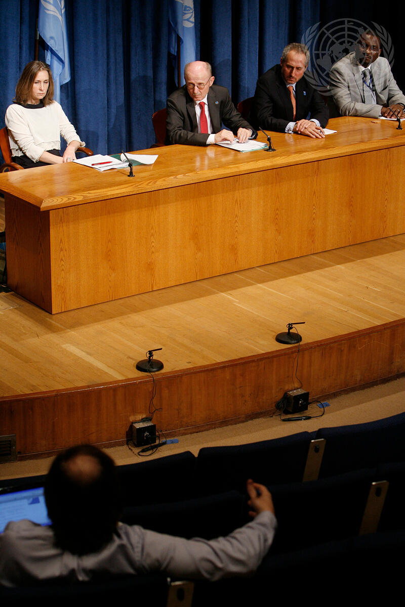 A joint press conference is held on the UN system's involvement in the upcoming 2010 FIFA World Cup in South Africa. Briefing on the subject, are (left to right): Liza Barrie, Deputy Director at the UN Children's Fund (UNICEF)'s Office of Public Partnerships; Wilfried Lemke, Special Adviser to the Secretary-General on Sport for Development and Peace; Stéphane Dujarric, Director of Communications at the UN Development Programme (UNDP); and Munyaradzi Chenje, the UN Environment Programme (UNEP)'s Head of Policy Coordination and Inter-Agency Affairs.
