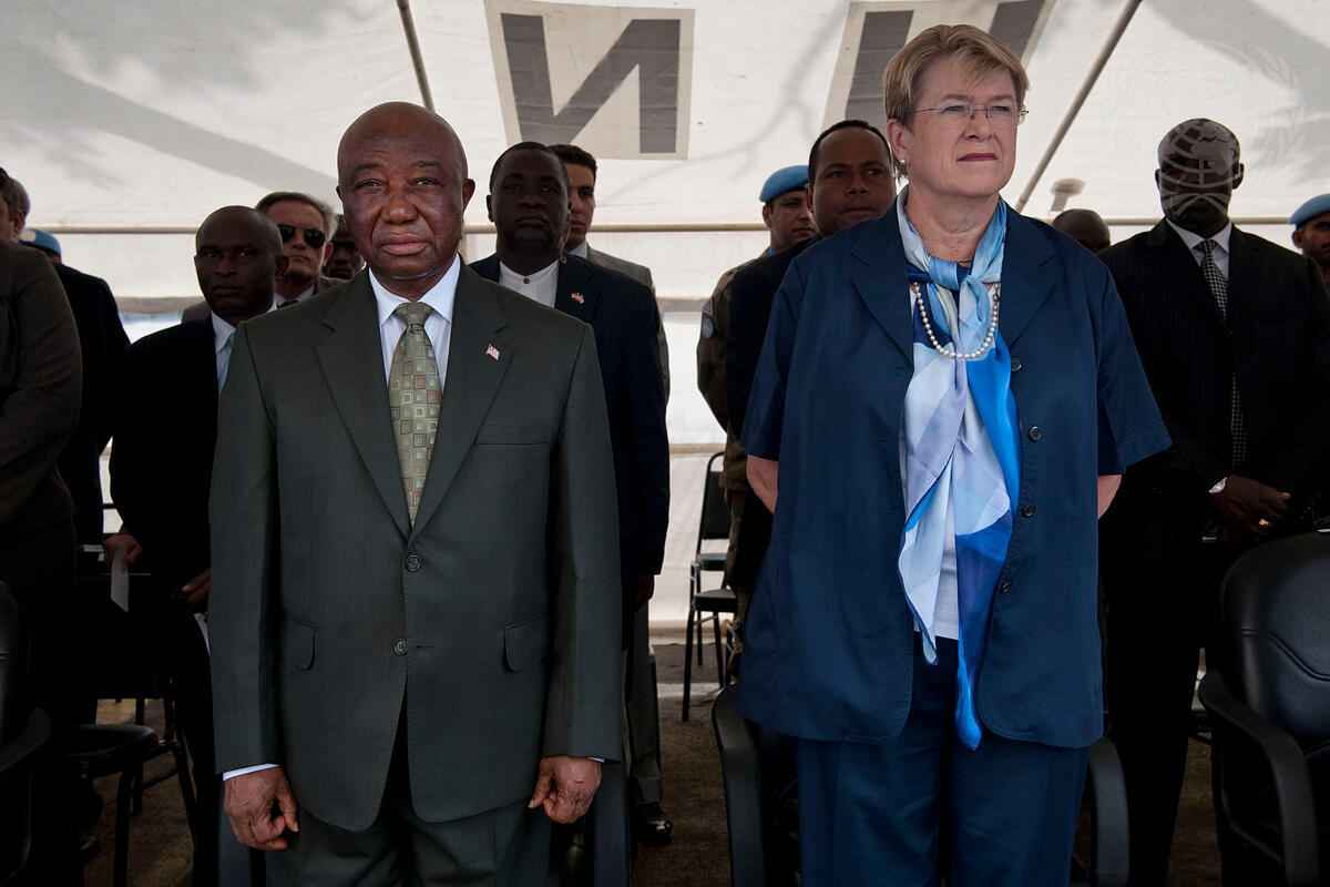 Ellen Margrethe Løj (right), Special Representative of the Secretary-General for Liberia, and Joseph N. Boakai, Vice-President of Liberia, stand as the ""Last Post"" is played during a commemoration of the International Day of United Nations Peacekeepers in Monrovia, Liberia.