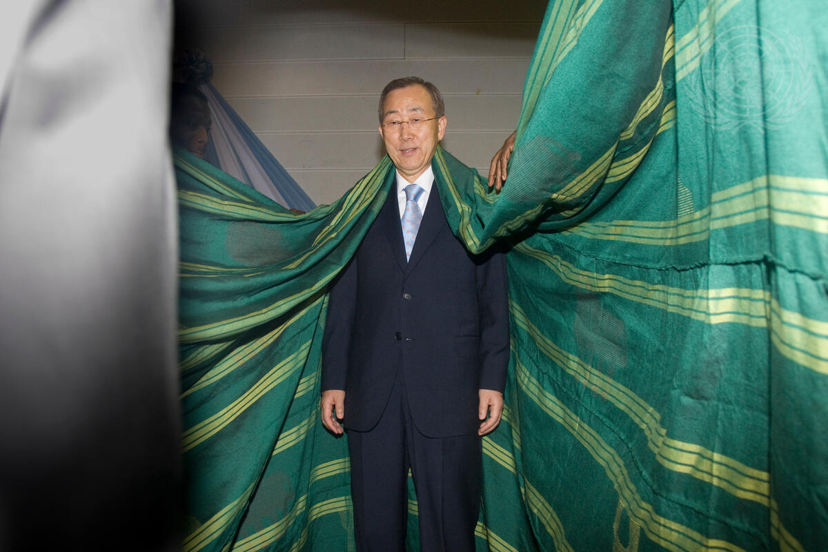 Secretary-General Ban Ki-moon is fitted with a traditional Beninese chief’s robe at the Palais des Congrès in Cotonou, following his televised address to the people of Benin.