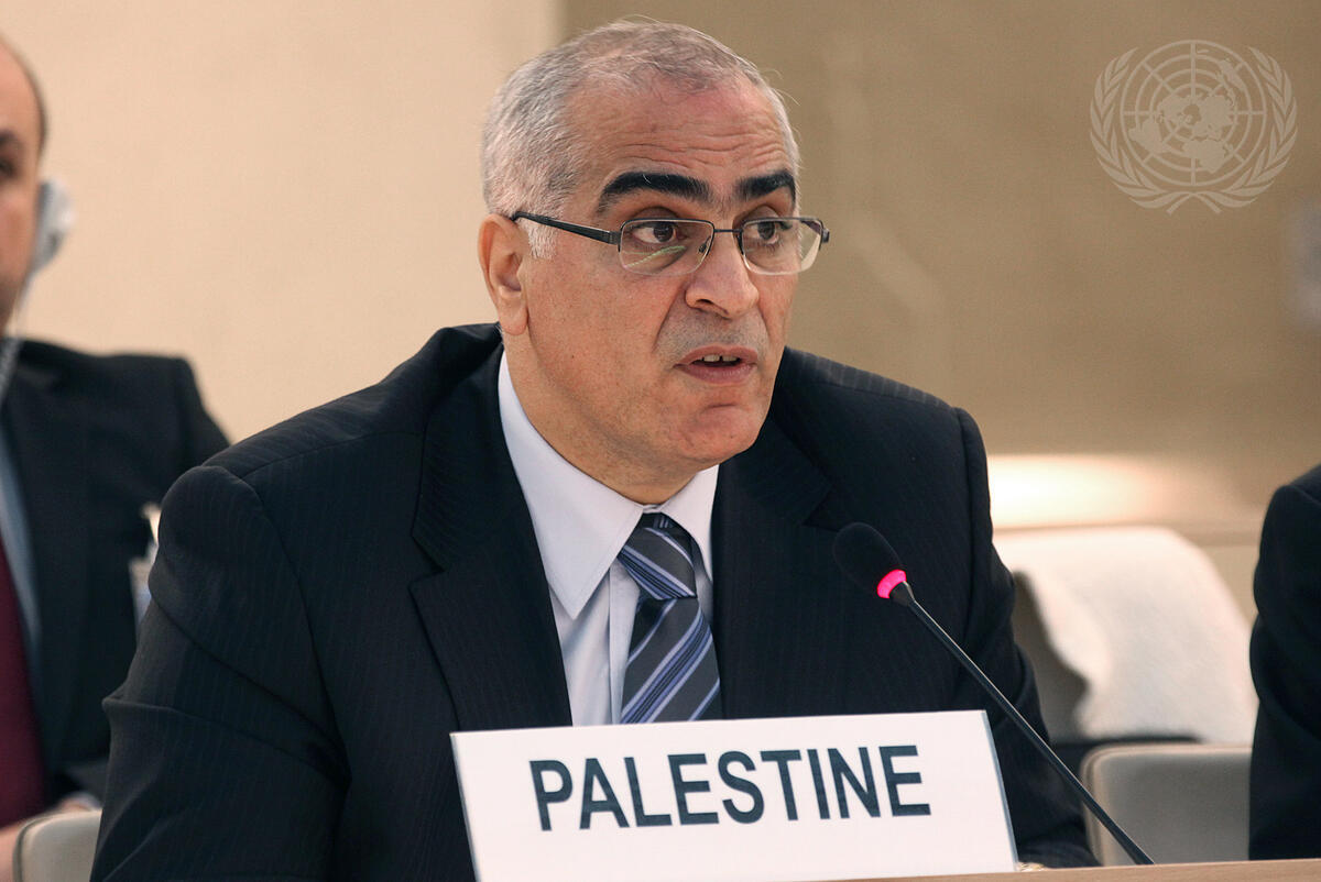 Ibrahim Khraishi, Permanent Observer of Palestine to the United Nations Office at Geneva (UNOG), addresses the Human Rights Council prior to the Council's adoption of a resolution deciding to dispatch an independent, international fact finding mission into the 31 May Israeli raid on a Gaza aid flotilla. The resolution deplored the loss of life in the raid and urged a lifting of the Gaza blockade.