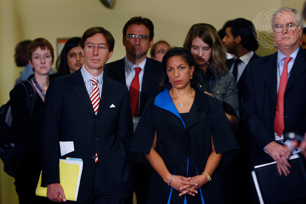 Caption Description Susan E. Rice (front row, right), Permanent Representative of the United States of America to the UN, and Peter Wittig (beside Ms. Rice), Permanent Representative of Germany to the UN, listen as the President of the Security Council for June, Claude Heller, briefs journalists on the Council's adoption of resolution 1929 (2010), which imposes new sanctions on Iran over its nuclear enrichment activities.