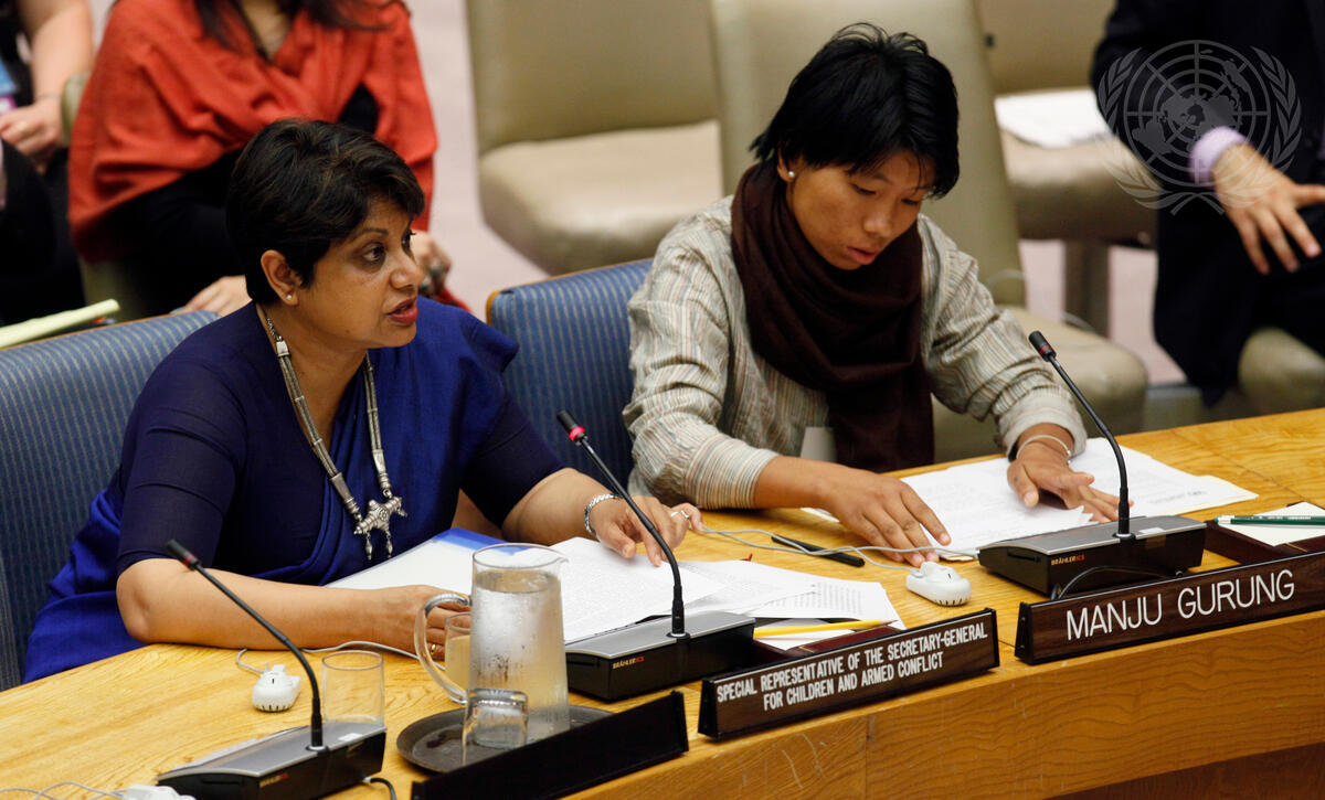 Radhika Coomaraswamy (left), Special Representative of the Secretary-General for Children and Armed Conflict, addresses the Security Council at its meeting on that issue. At right is Manju Gurung, a young Nepalese, who also addressed the Council, recounting her ordeal of abduction by Nepal's Maoists at the age of 13.