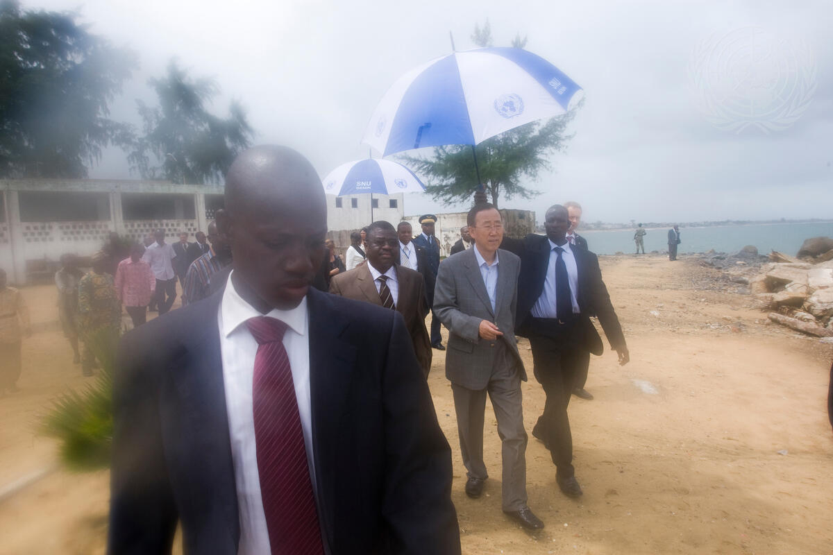 Secretary-General Ban Ki-moon (under umbrella, left) takes a firsthand look at coastal erosion on the shores of Cotonou, Benin.