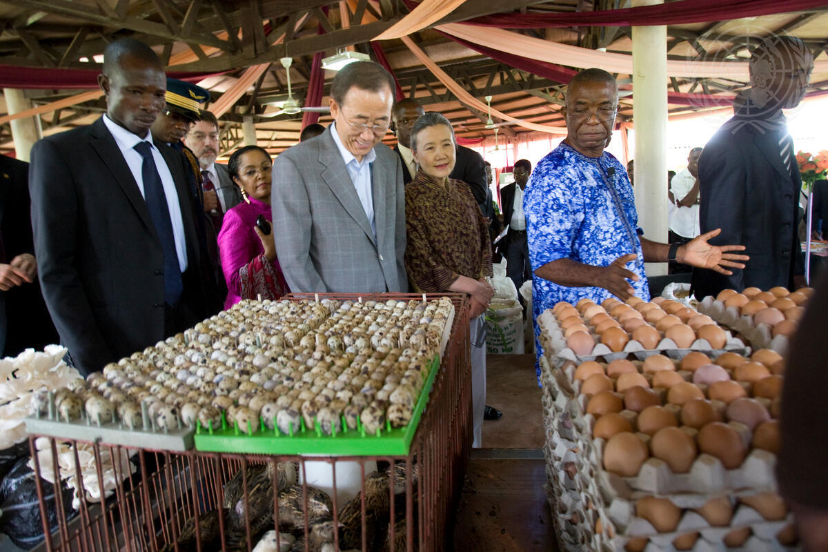 Secretary-General Ban Ki-moon (front, second from left) is shown an array of products locally farmed at the Centre Songhai, a non-governmental organization specialising in research, training and development of sustainable agricultural practices, in Porto Novo, Benin. To the right of Mr. Ban is his wife, Yoo Soon-taek.
