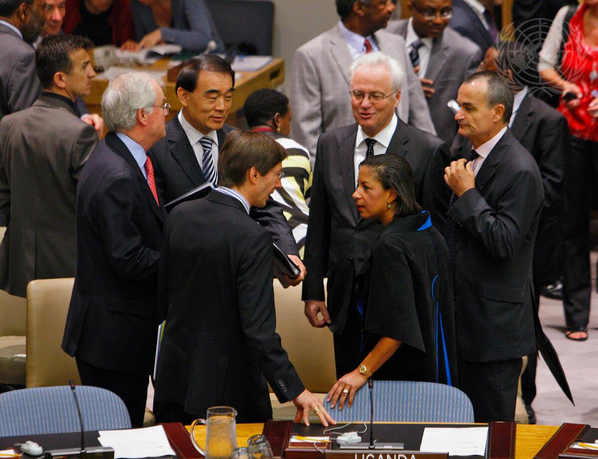 Susan E. Rice (front, right), Permanent Representative of the United States of America to the UN, chats with Peter Wittig, Permanent Representative of Germany to the UN, prior to a Security Council meeting at which the Council adopted resolution 1929 (2010), imposing new sanctions against Iran. Beside them are representatives of permanent members of the Council (from left to right): Mark Lyall Grant, Permanent Representative of the United Kingdom; Li Baodong, Permanent Representative of the People's Republic of China; Vitaly I. Churkin, Permanent Representative of the Russian Federation; and Gérard Araud, Permanent Representative of France.