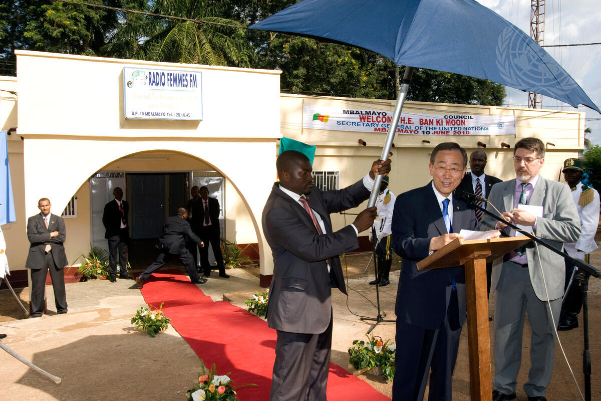 Secretary-General Ban Ki-moon delivers a speech in Mbalmayo, Cameroon, where the community is engaged in a number of projects related to the Millennium Development Goals (MDGs). Behind Mr. Ban are the offices for Radio Femmes FM, a local radio station.