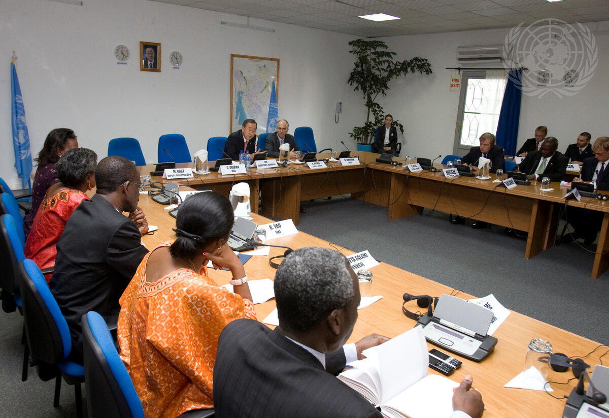 Secretary-General Ban Ki-moon (head of table, left) meets with senior officials of the UN system based in Bujumbura, Burundi. Beside Mr. Ban is Charles Petrie, his Executive Representative for Burundi and Head of the UN Integrated Office in Burundi (BINUB).