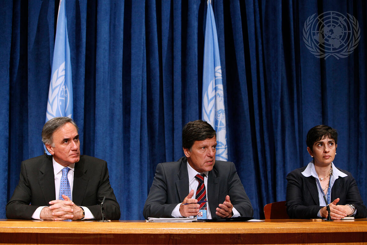 Francisco Verros (centre), Chairman of the 6th Plenary of the Contact Group on Piracy off the Coast of Somalia, addresses a joint press conference on the work of the Contact Group. Mr. Verros was joined by Anastassis Mitsialis (left), Permanent Representative of Greece to the UN, and Polyxeni Mastroperrou, Press Counsellor at the Permanent Mission of Greece to the UN.
