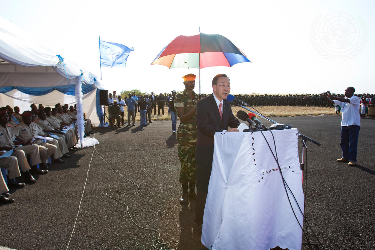 Secretary-General Ban Ki-moon (at podium) addresses the 4th Burundian battalion of the African Union Mission in Somalia (AMISOM), soon to be deployed, in Bujumbura, Burundi.