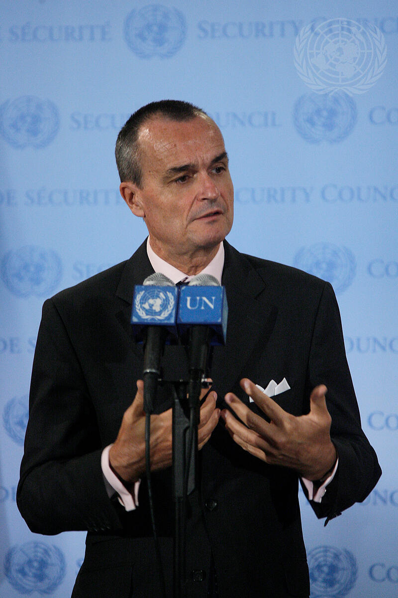 Gérard Araud, Permanent Representative of France to the UN, briefs correspondents following the Security Council's adoption of resolution 1929 (2010), imposing new sanctions on Iran over its nuclear enrichment activities.
