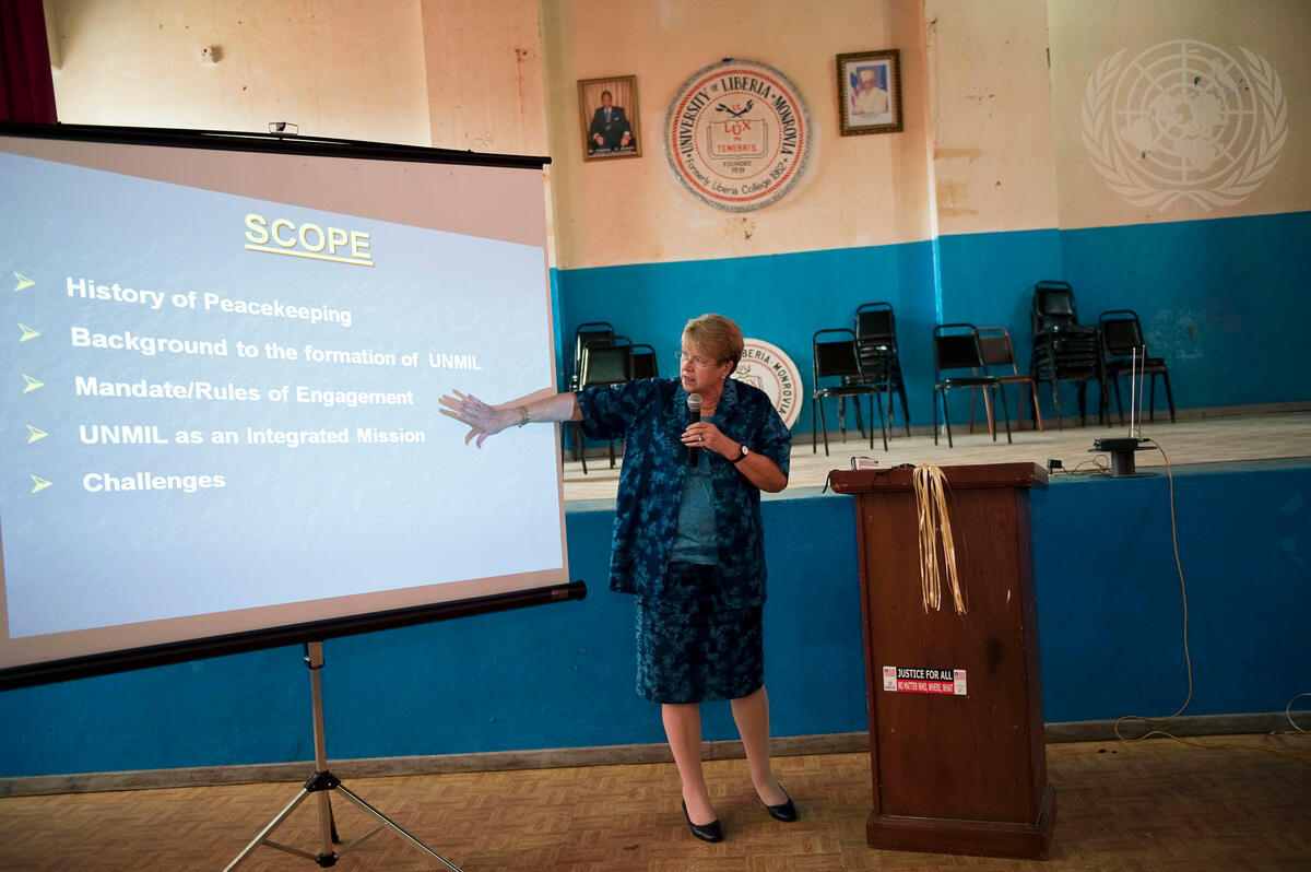 Ellen Margrethe Løj, Special Representative of the Secretary-General for Liberia, conducts a seminar on peacekeeping for students at the University of Liberia in Monrovia.