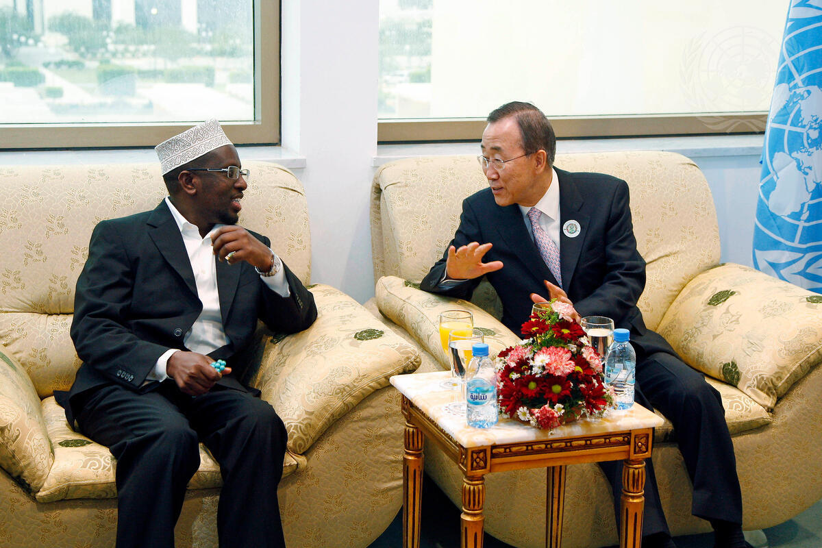 Secretary-General Ban Ki-moon (right) meets with Sheikh Sharif Sheikh Ahmed, President of the Somali Republic, during the 22nd Summit Conference of the League of Arab States in Sirte, Libya.