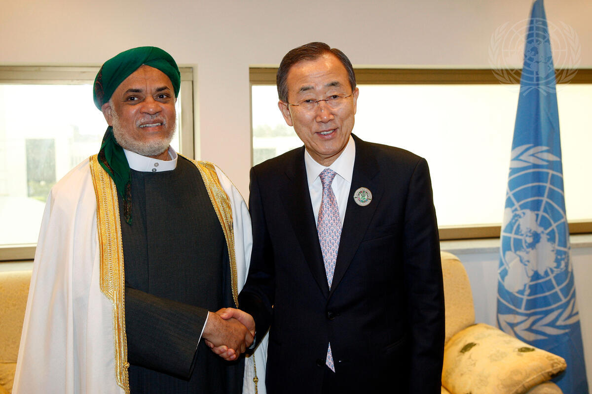 Secretary-General Ban Ki-moon (right) meets with Ahmed Abdallah Sambi, President of the Union of the Comoros, during the 22nd Summit Conference of the League of Arab States in Sirte, Libya.