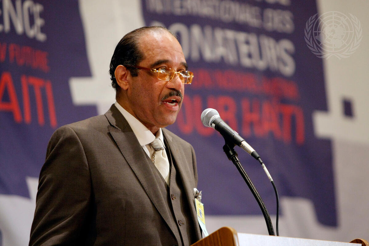 Joseph Baptiste, Chairman of the National Organization for the Advancement of Haitians and a representative of the Haitian Diaspora, addresses the ministerial ""International Donors' Conference Towards a New Future for Haiti"".