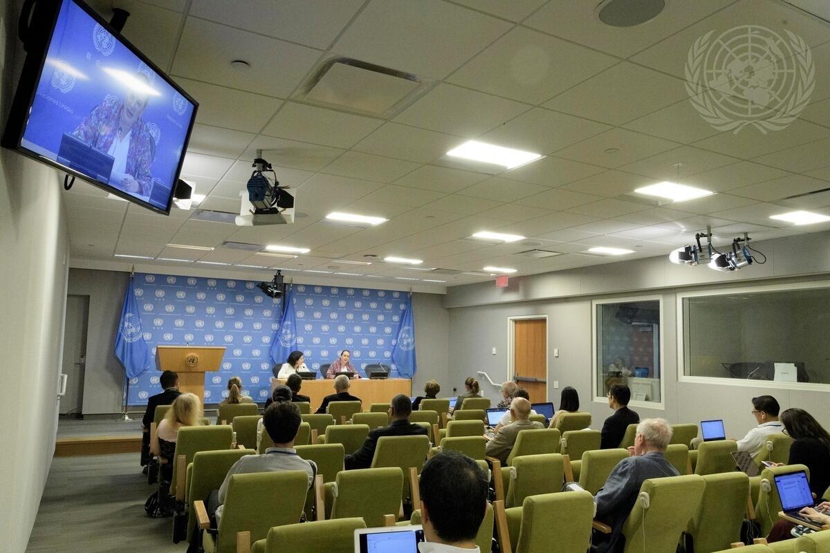María Fernanda Espinosa Garcés (on screen and right at dais), President of the seventy-third session of the General Assembly, briefs press. At left at dais is Monica Grayley, Spokesperson for the President.