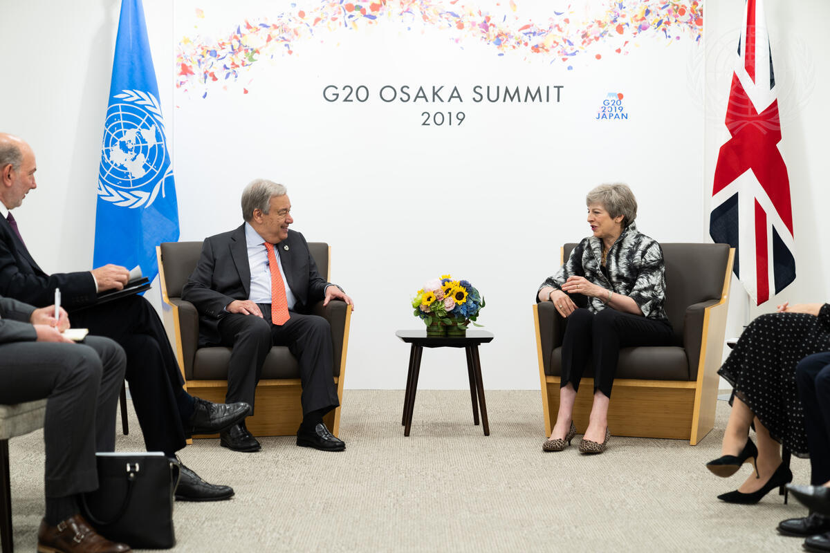 Secretary-General António Guterres (left) meets with Theresa May, Prime Minister of the United Kingdom, during the G20 Summit in Osaka, Japan.