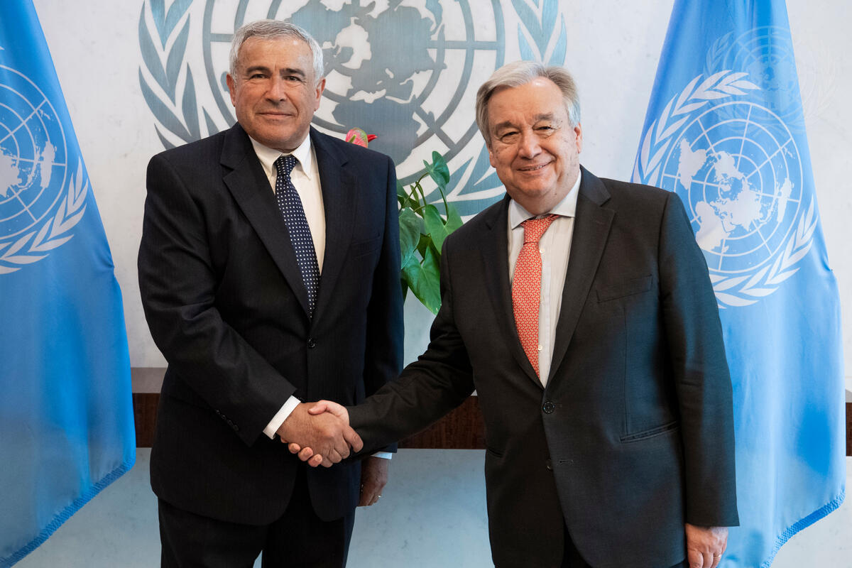 Sven Alkalaj (left), new Permanent Representative of Bosnia and Herzegovina, presents his credentials to Secretary-General António Guterres.