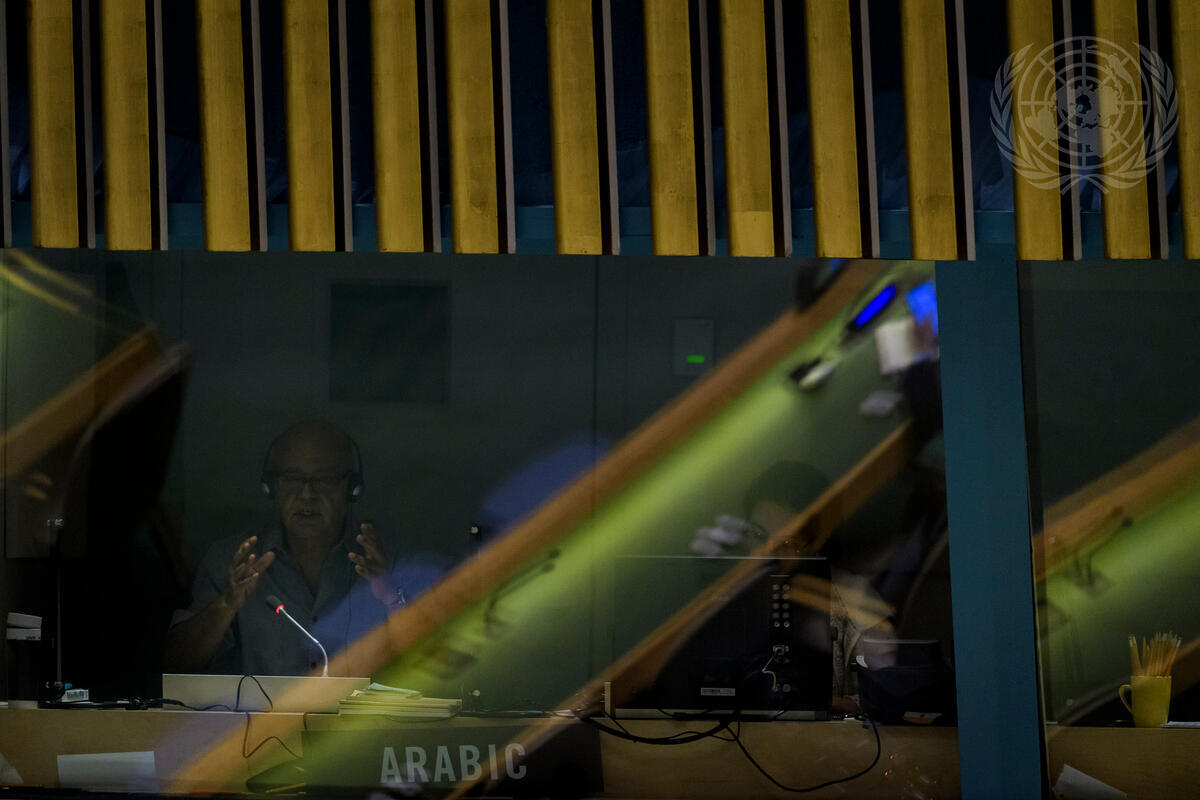 A view of the Arabic interpretation booth during the General Assembly meeting on the responsibility to protect and the prevention of genocide, war crimes, ethnic cleansing and crimes against humanity.
