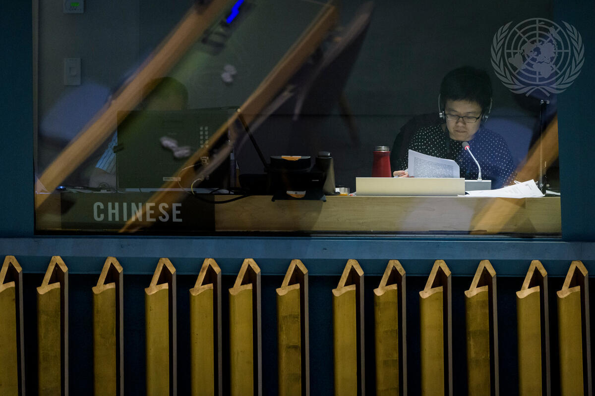 A view of the Chinese interpretation booth during the General Assembly meeting on the responsibility to protect and the prevention of genocide, war crimes, ethnic cleansing and crimes against humanity.