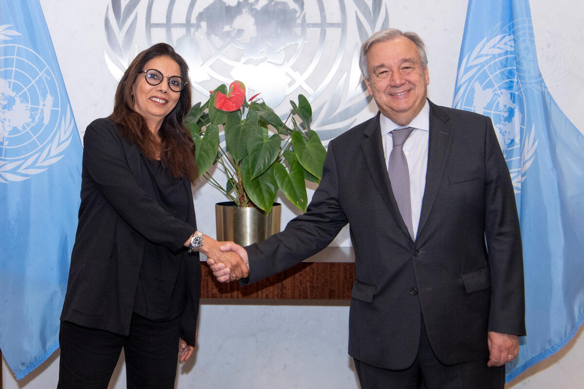Secretary-General António Guterres (right) swears in Najat Maalla, Special Representative of the Secretary-General on Violence Against Children.
