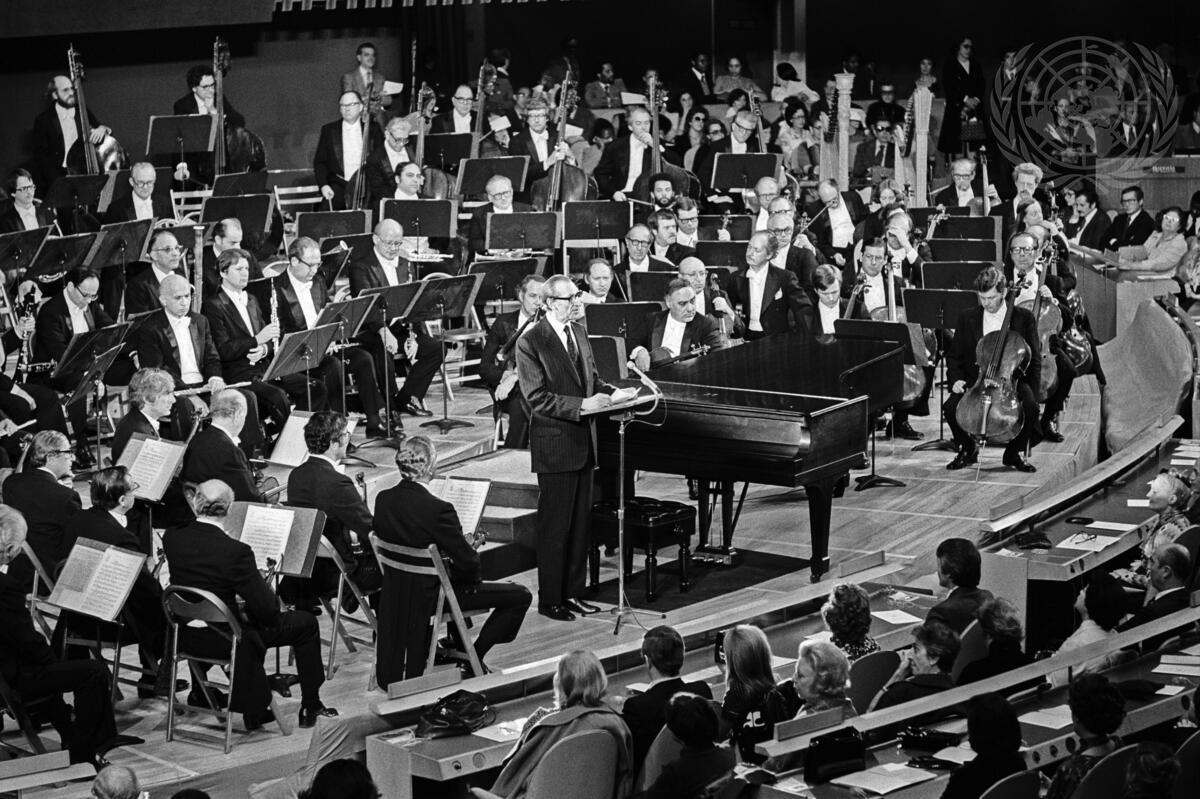 The thirty-second anniversary of the United Nations was marked by a concert in the General Assembly Hall on Monday, 24 October 1977, at 8:00 p.m. The Philadelphia Orchestra under the direction of Eugene Ormandy performed works by Beethoven - the Egmont Overture and the Fourth Piano Concerto - and the Fifth Symphony by Dmitri Shostakovich. Andre Watts was the piano soloist.