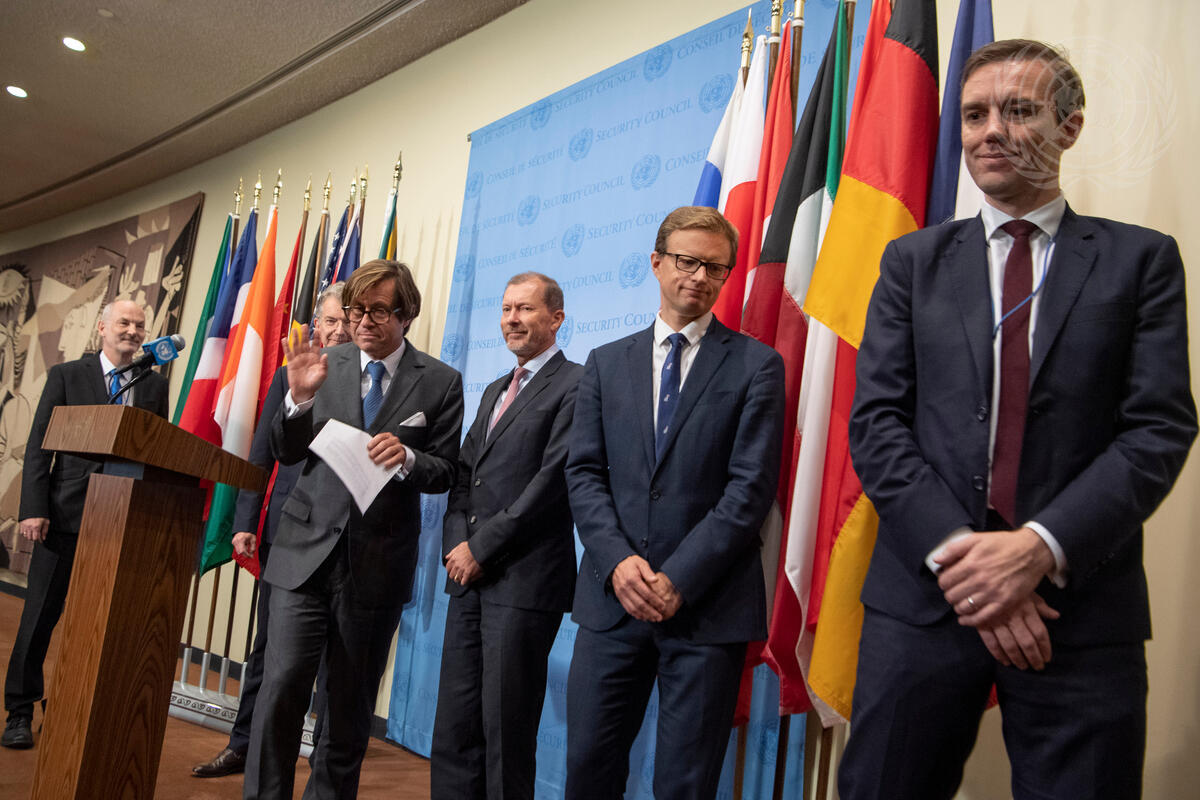 From left to right: Sven Jürgenson, Permanent Representative of the Republic of Estonia to the United Nations; Christoph Heusgen, Permanent Representative of Germany to the UN; Nicolas De Rivière, Permanent Representative of France to the UN; Marc Pecsteen de Buytswerve, Permanent Representative of Belgium to the UN; Mariusz Lewicki, Deputy Permanent Representative of Poland to the UN; and David Clay, Acting Political Coordinator of the Permanent Mission of the United Kingdom to the UN."