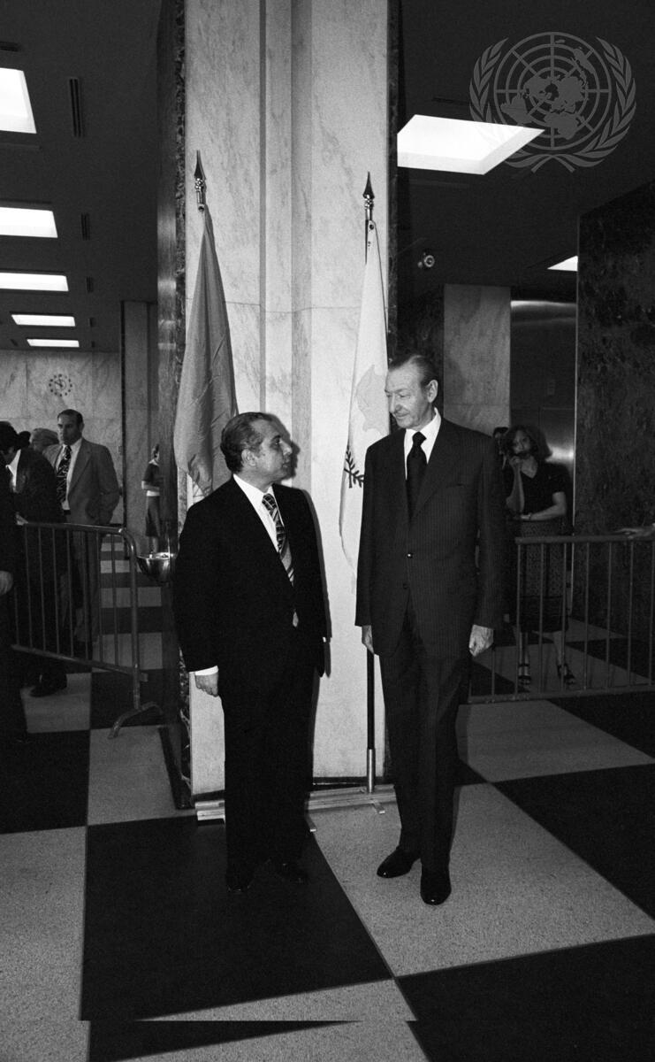 The President of Cyprus, Spyros Kyprianou, paid an official visit to the United Nations on Monday, 22 May. Upon his arrival at the United Nations, he was received by Secretary-General Kurt Waldheim (right). After conferring with Mr. Waldheim and the General Assembly President, Lazar Mojsov (Yugoslavia), the President of Cyprus held a press conference at UN Headquarters. Mr. Kyprianou is due to address the tenth special session of the General Assembly devoted to disarmament on 24 May.