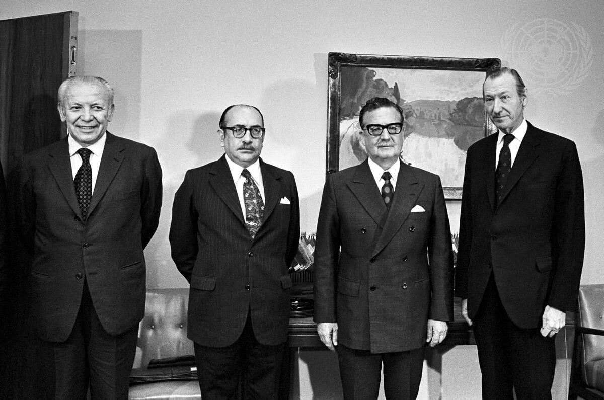 Here, President Allende is seen during his meeting with Secretary-General Kurt Waldheim. At left is Humberto Diaz-Casanueva, Permanent Representative of Chile to the U.N. Second from left is Colodomiro Almeyda, Minister for Foreign Affairs of Chile.