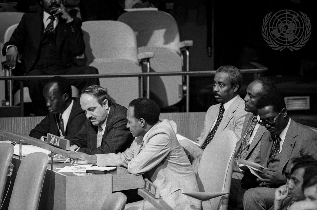 The delegation of the Sudan headed by El-Rashid El-Tahir Bakr, Vice-President and Minister for Foreign Affairs of the Sudan, listening to President Gaafar Mohamed Nimeiri’s address to the Assembly on 27 September.
