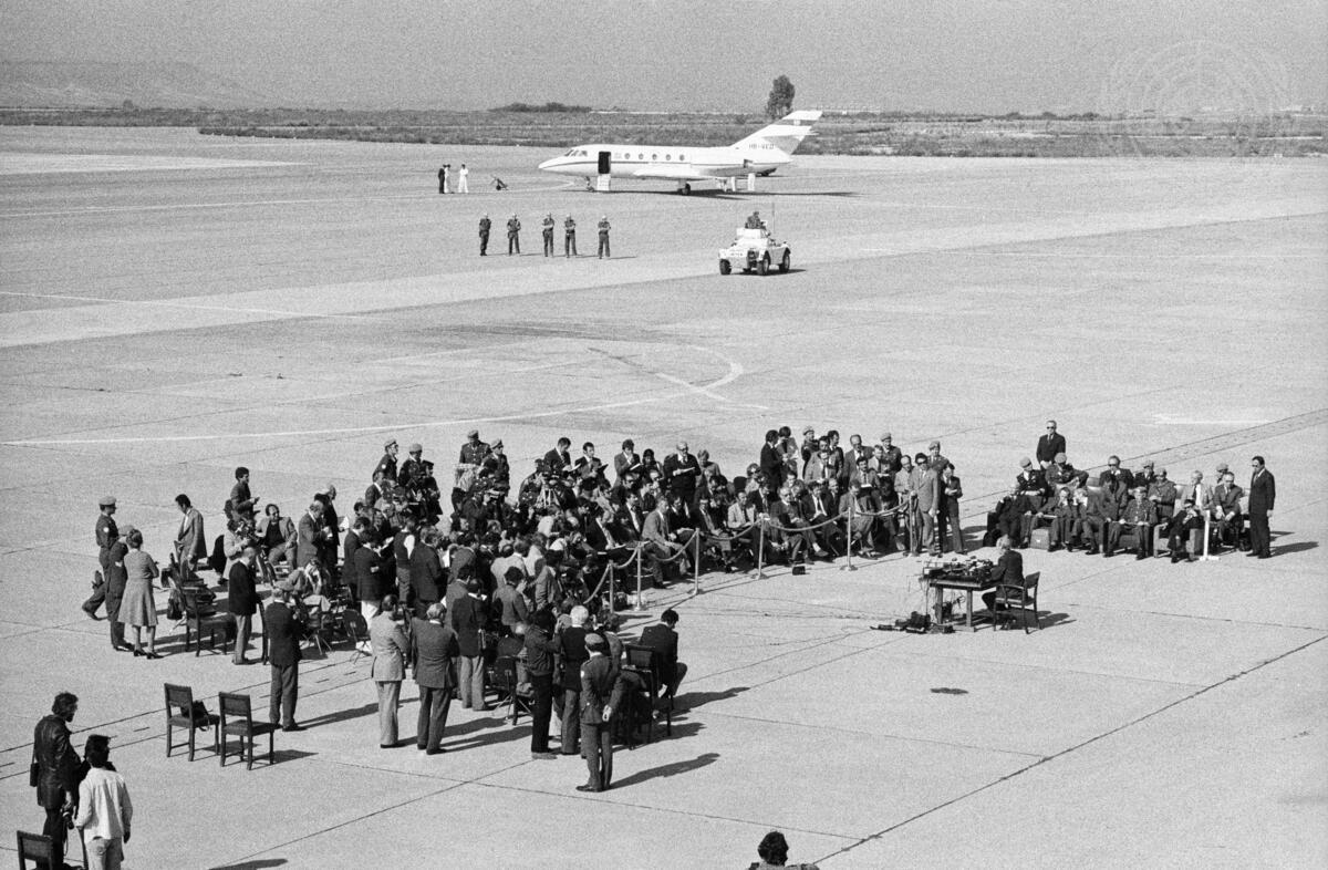 Secretary-General Kurt Waldheim holding a forty-minute, open-air press conference in front of the terminal at the Nicosia International Airport which has not been in use since the war of July/August 1974. The press conference was attended by a large gathering of newsmen –Greek Cypriot, Turkish Cypriot and the international press.