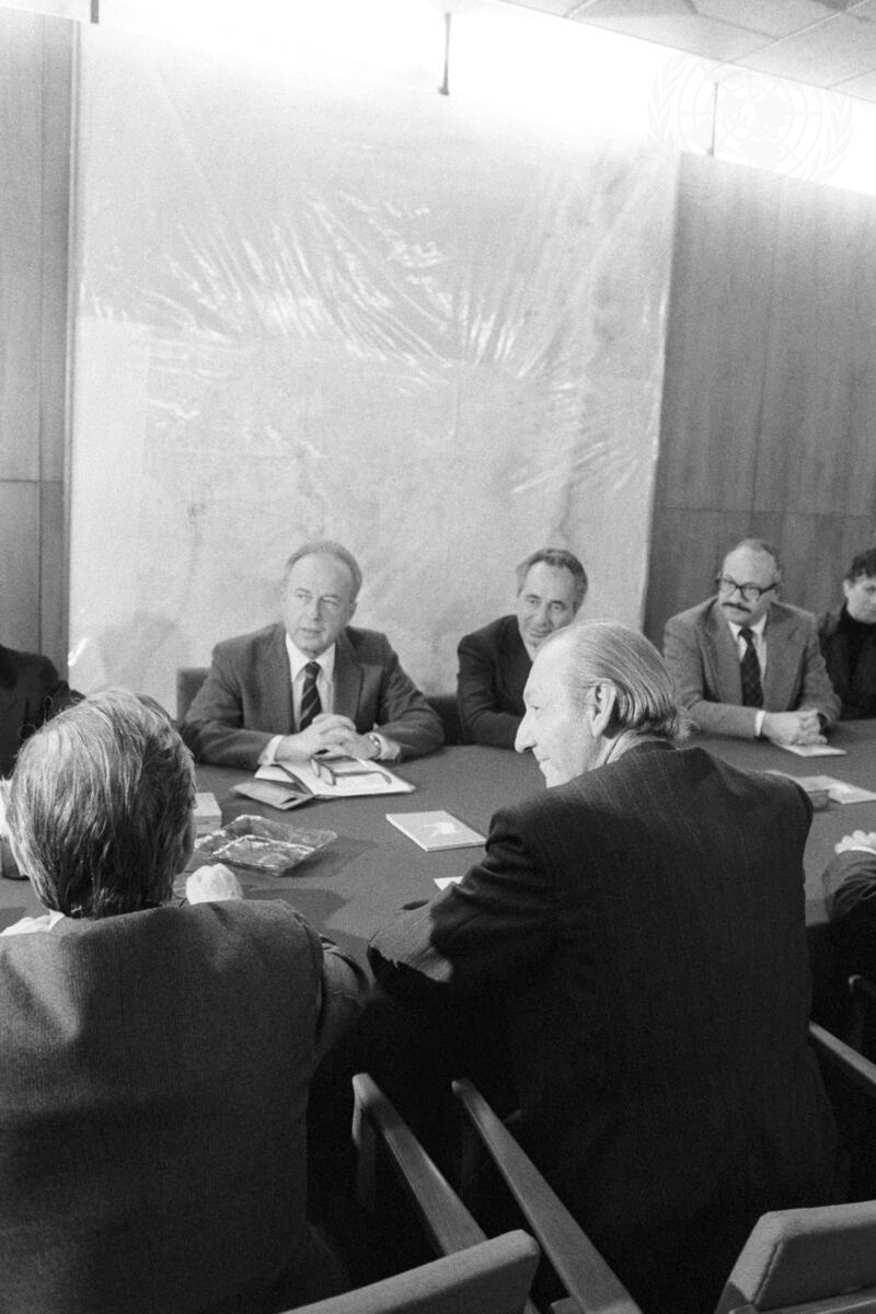 Secretary-General Kurt Waldheim meeting with the Prime Minister of Israel, Yitzak Rabin. Also present at the meeting were: Foreign Minister of Israel; Yigal Allon, the Defence Minister Shimon Peres; and the United Nations Under-Secretaries-General for Special Political Affairs, Roberto E. Guyer and Brian E. Urquhart.