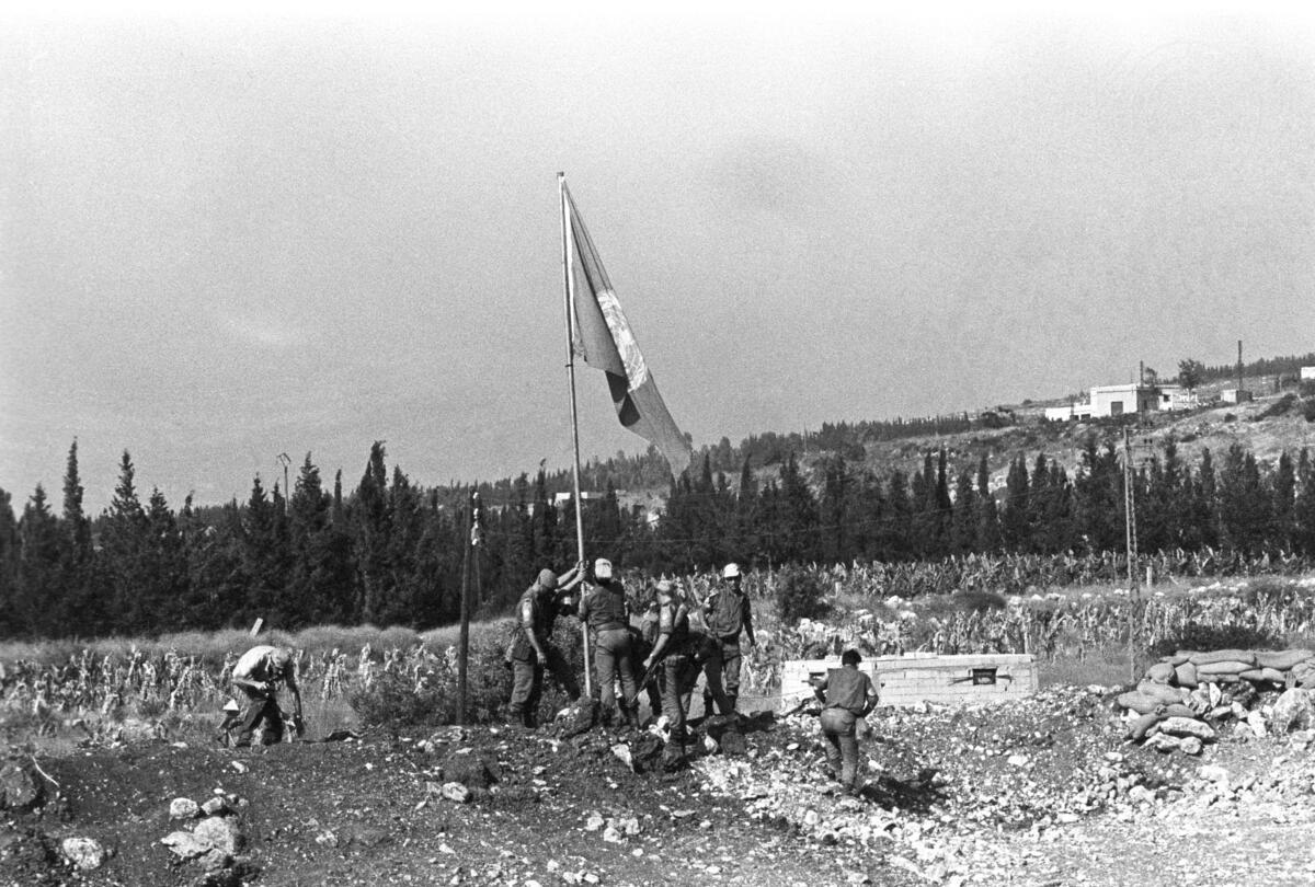 Members of the French contingent raise the UN flag as they take over an Israeli position during the withdrawal of the Israeli forces from the remaining occupied area in southern Lebanon on 13 June.