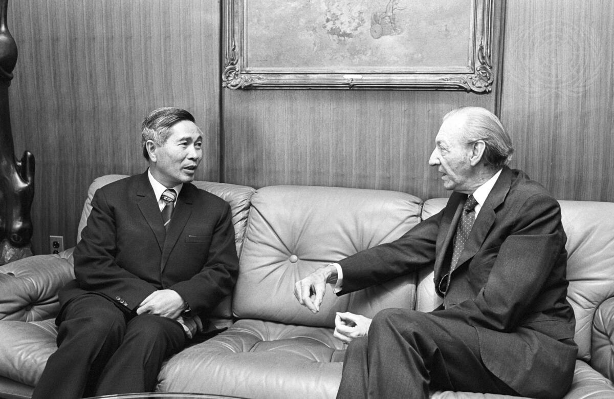 Secretary-General Kurt Waldheim (right) conferring in his office at UN Headquarters with Nguyen Co Thach, Viet Nam's Minister for Foreign Affairs. The Foreign Minister was here to attend the 35th Session of the General Assembly.