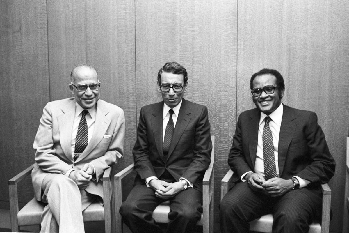 The President of the General Assembly, Salim A. Salim (right) of the United Republic of Tanzania, today met with the Minister for Foreign Affairs of Egypt, Boutros Ghali (centre), at United Nations Headquarters. The Minister was accompanied by the Permanent Representative to the UN, Ambassador Ahmed Esmat Abdel Meguid. Mr. Ghali is in New York to attend the seventh emergency special session of the General Assembly on the question of Palestine.
