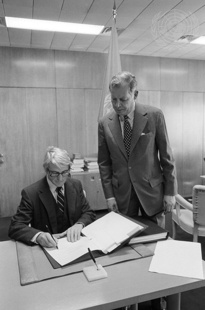 Pierre Malve, Head of the EEC delegation to the UN, signs the Agreement as UN Treaty Section Chief Philippe C. Giblain looks on.