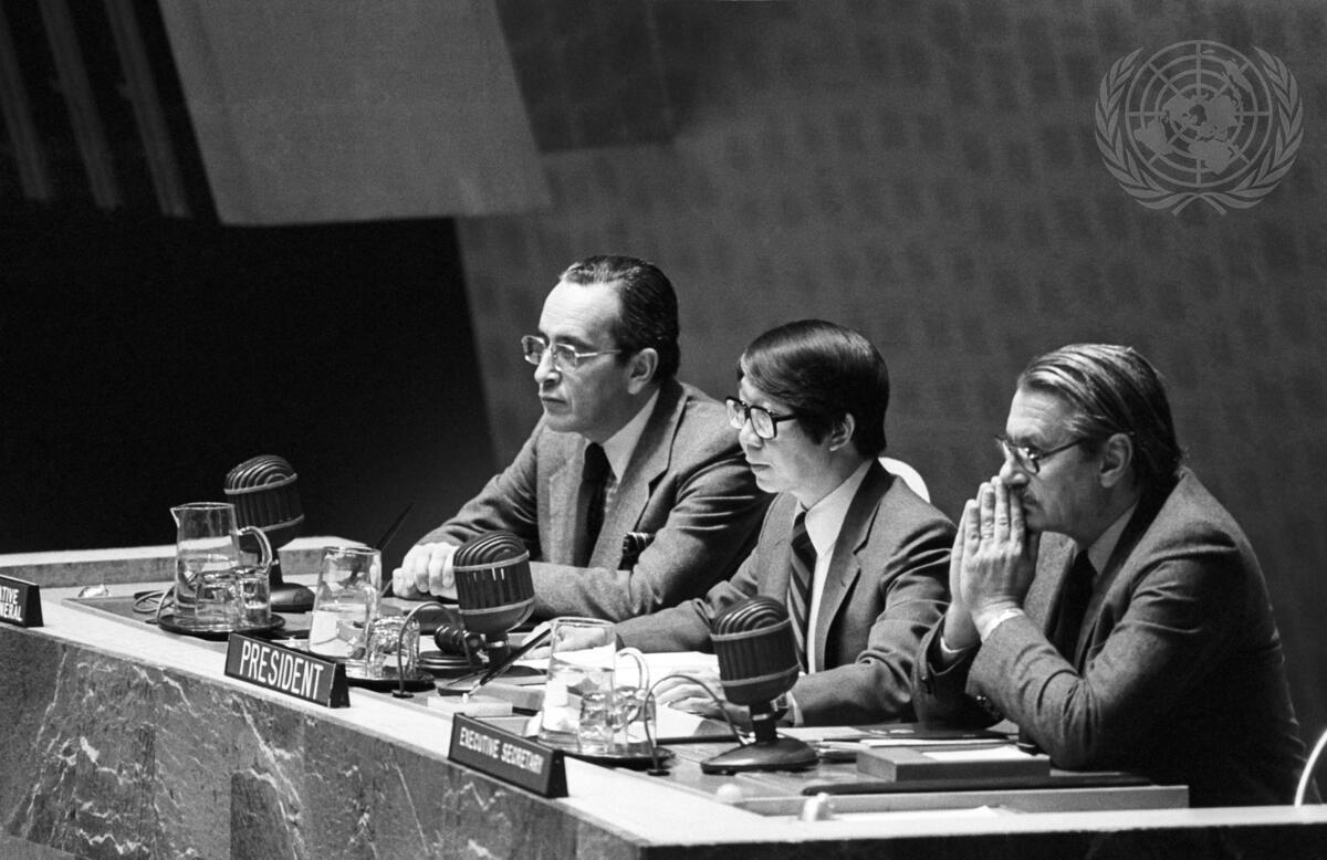 Seated at the dais during the meeting today are, from left, Bernardo Zuleta, Under-Secretary-General, Secretariat of the Third United Nations Conference on the Law of the Sea; Tommy T. B. KOH (Singapore), President of the Conference; and David L. D. Hall, Executive Secretary of the Conference.