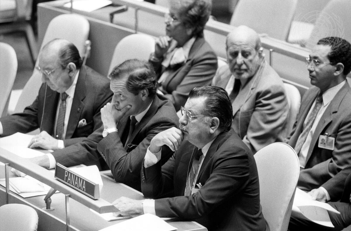 Delegation of Panama, headed by Jorge Abadia Arias, Minister for Foreign Affairs, seated behind name plate, attending the General Assembly today.