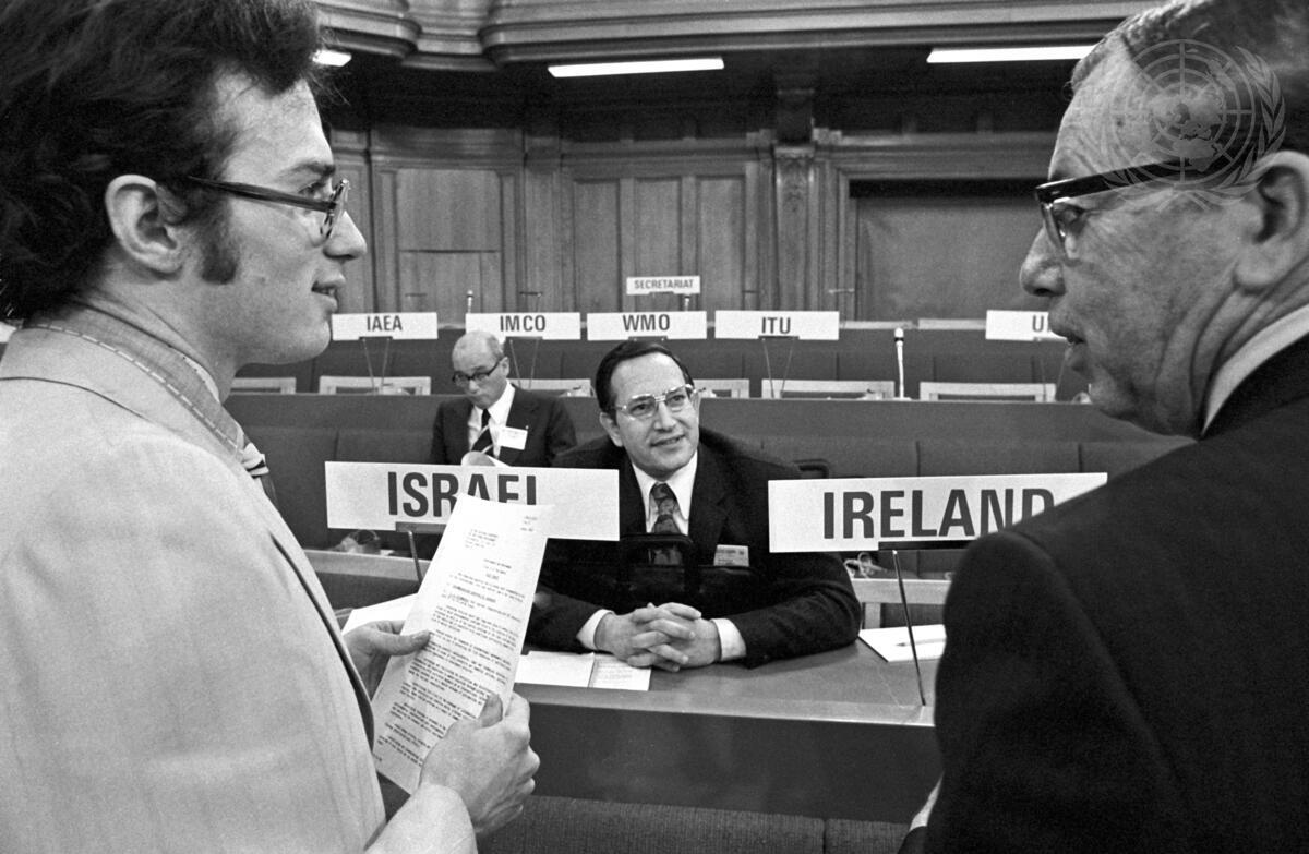 From left, before the opening of a meeting of the Second Committee held on 12 June are: Dr. N. Riddel (Canada), Dr. Ami Shachori (Israel) and Senator AIan Macnaughton (Canada).