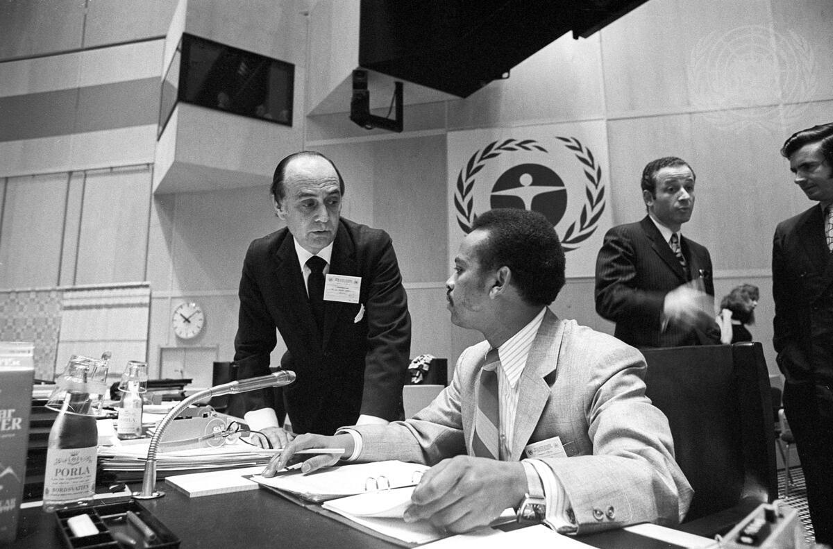 Carlos Calero Rodrigues (left) of Brazil, Chairman of the Third Committee, conversing with A.M.A. Hassan (Sudan), Rapporteur.