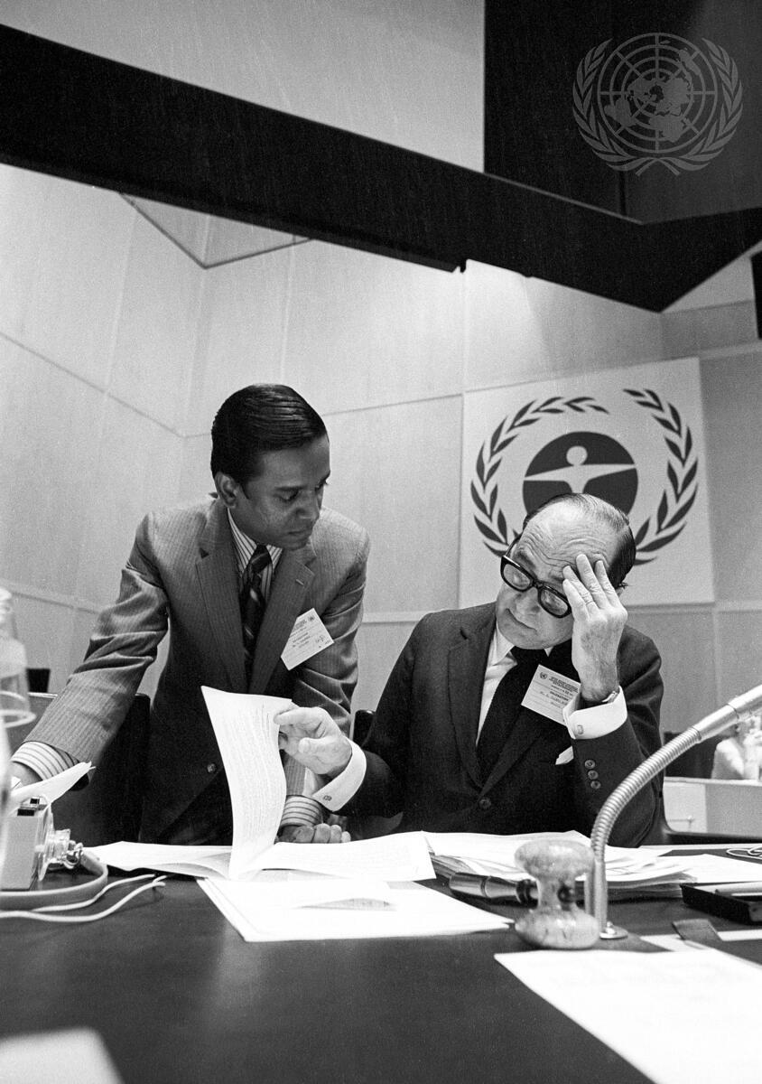 S. Jayakumar (left), of Singapore, conversing with Carlos Calero Rodrigues, Chairman of the Third Committee (pollution and organizational matters) during its meeting held on 13 June.