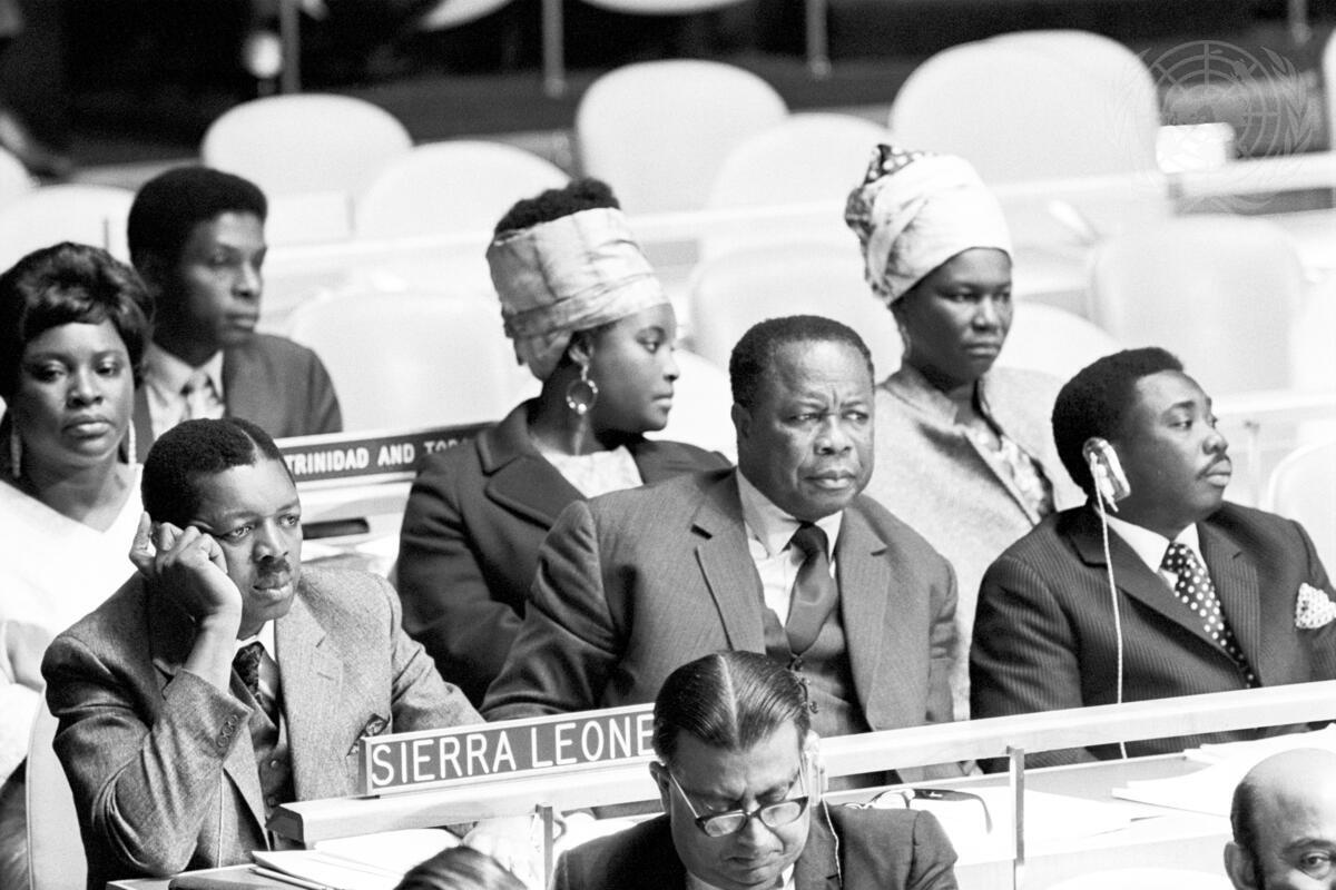 Seen here is the delegation of Sierra Leone headed by Solomon A.J. Pratt (left), Minister of External Affairs. Seated next to him is Ismael Byen Taylor-Kamara, Permanent Representative to the United Nations.