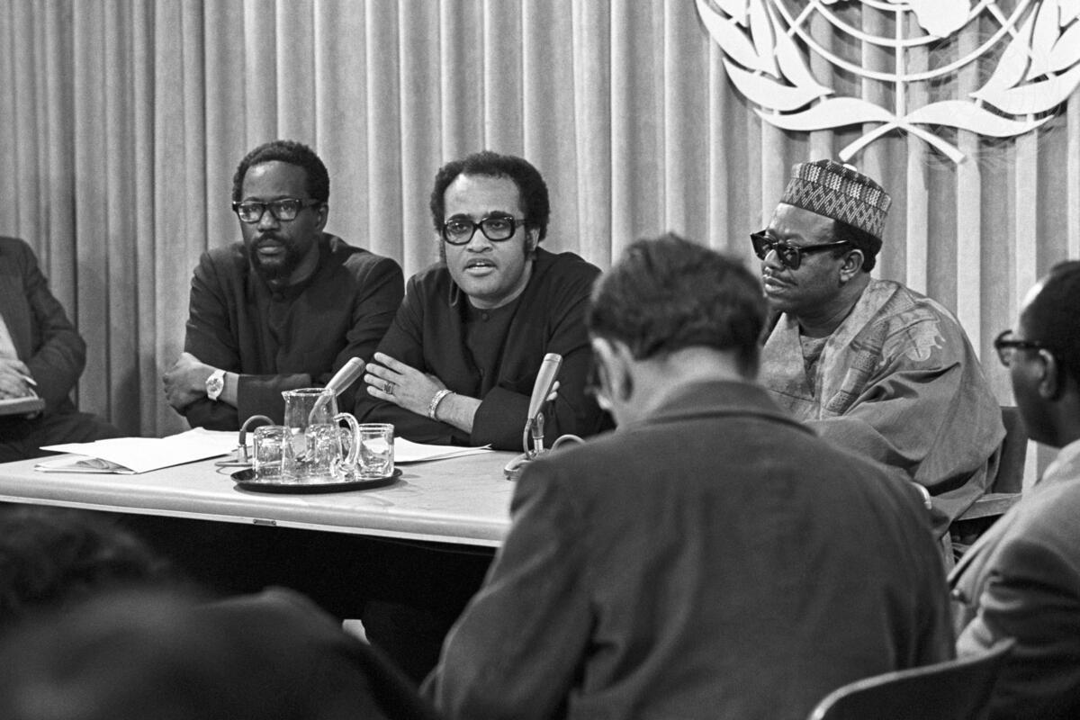 A view of the press conference held at United Nations Headquarters today by (l. to r., at table): Rashleigh E. Jackson (Guyana), President of the Council for Namibia; Salim A. Salim (United Republic of Tanzania), Chairman of the Special Committee of 24 on Decolonization; and Edwin Ogebe Ogbu (Nigeria), Chairman of the Special Committee on Apartheid.