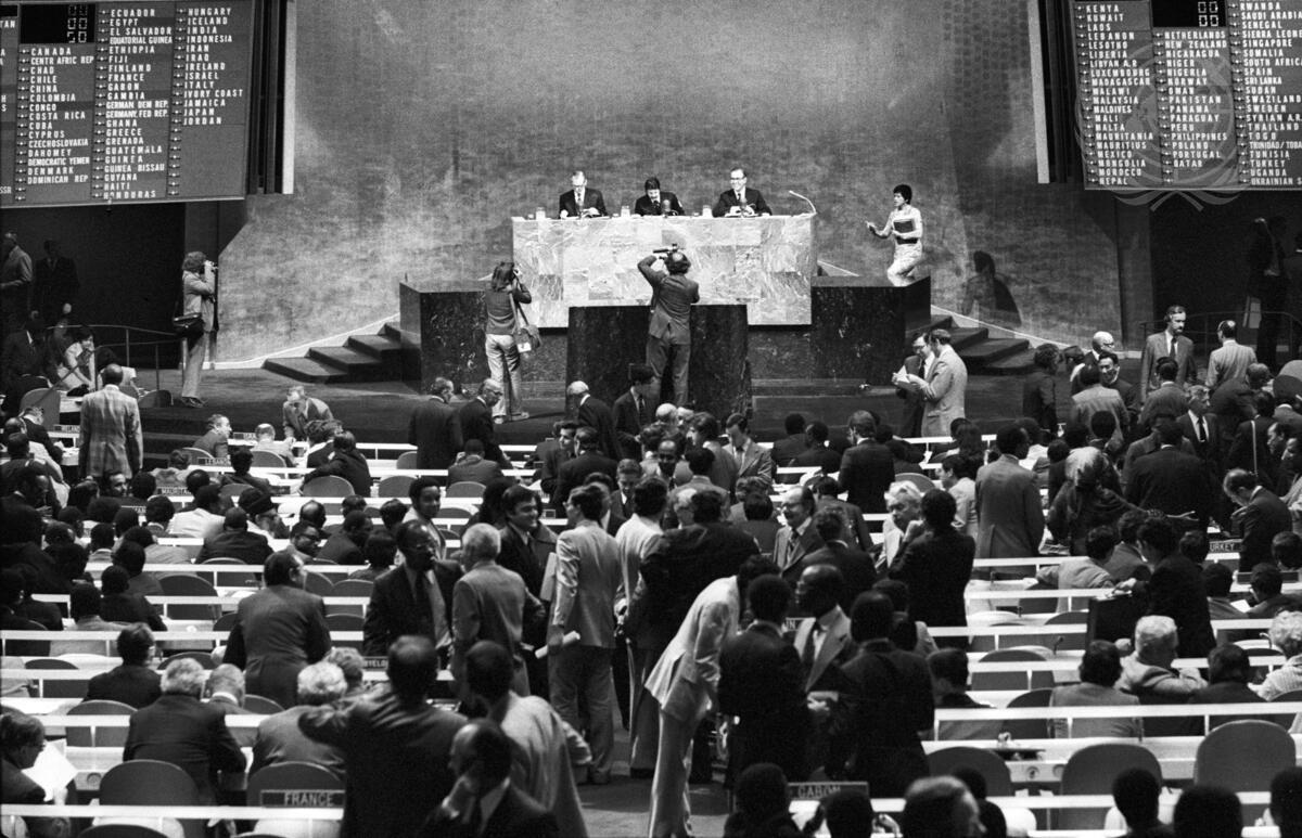 A view of the Assembly Hall before the Assembly was called to order. At the presidential rostrum, from left: Secretary-General Kurt Waldheim; Assembly President Abdelaziz Bouteflika (Algeria); and Bradford Morse, Under-Secretary-General for Political and General Assembly Affairs.