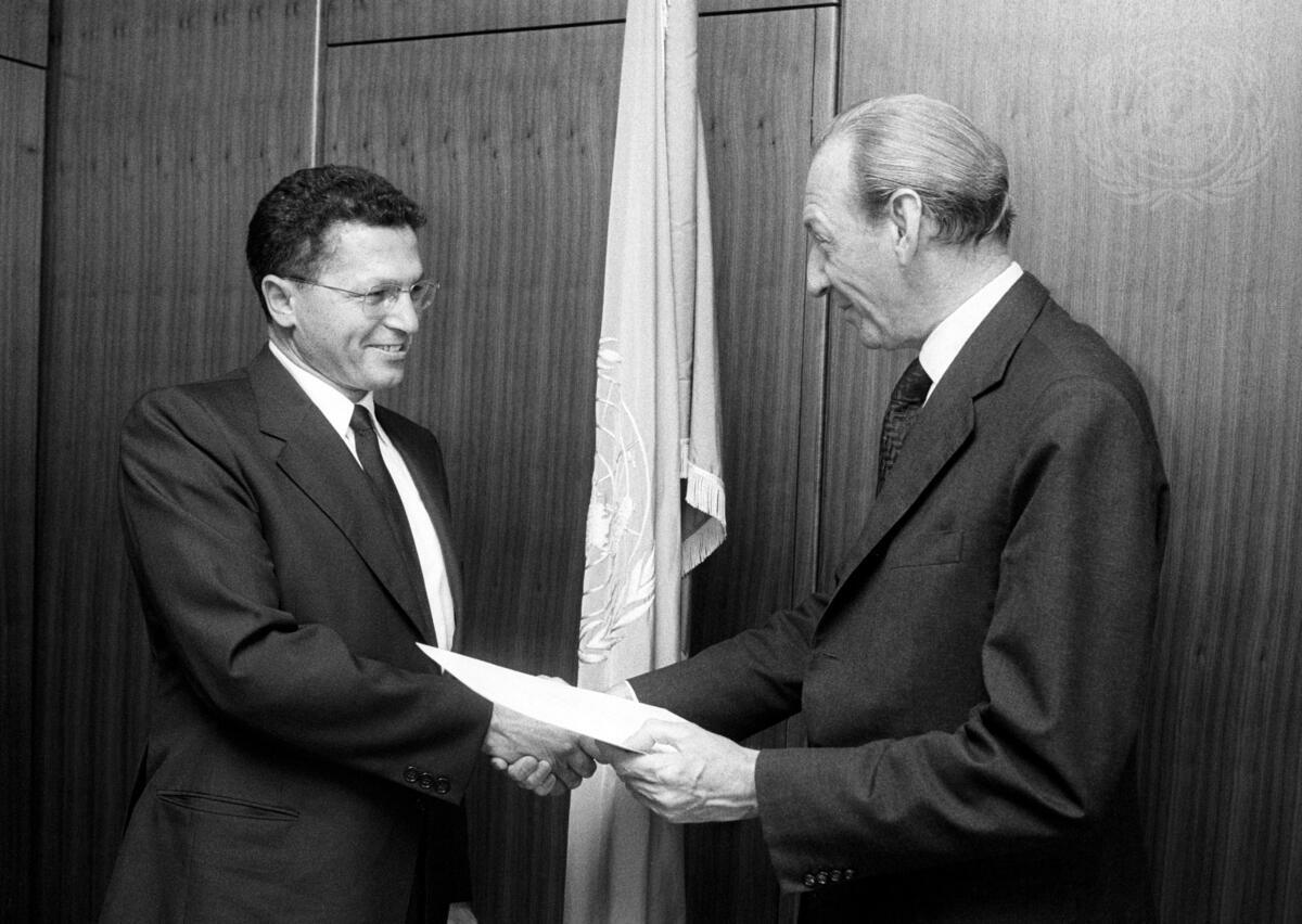 Mansur Rashid Kikhia, the new Permanent Representative of Libya to the United Nations, presenting his credentials to Secretary-General Kurt Waldheim at United Nations Headquarters today.