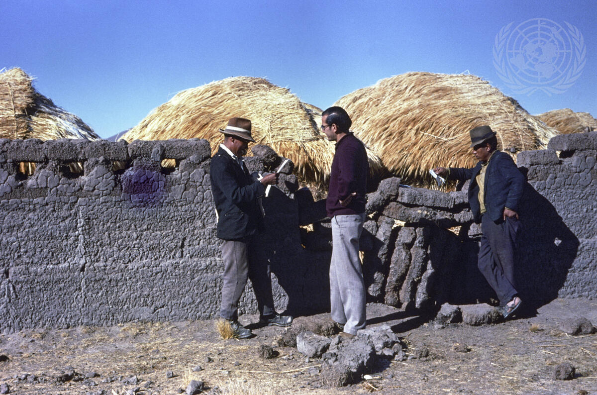 Rural workers, or campesinos, and G. Limpias (Bolivia), the local administrative secretary of the programme, look over the plans for new stables at Achica Bajo, an area not far from La Paz, where part of the agricultural improvement programme is concentrated. [Exact date unknown]